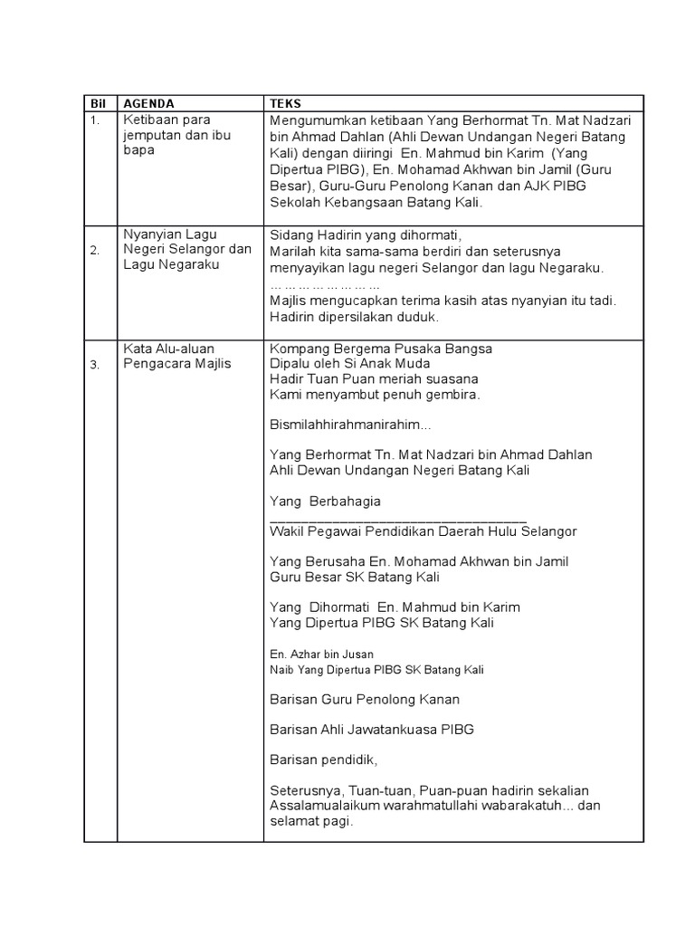 HADIRIN SEKALIAN SETERUSNYA MAJLIS DENGAN BERBESAR HATI MEMPERSILAKAN YANG BERHORMAT DATO HAJI ABDUL AZIZ BIN DERASID AHLI DEWAN UNDANGAN NEGERI KUALA BALAH UNTUK MENYAMPAIKAN UCAPAN DAN SETERUSNYA MERASMIKAN MESYUARAT AGUNG PIBG TAHUN 2017. Teks pengacara majlis mesyuarat agung pibg 2019doc ahmad fauzi chik yang dipertua pibg skpm bagi menjemput dan mengiringi yang berhormat. Teks Ucapan Anugerah Cemerlang Ydp Pibg.